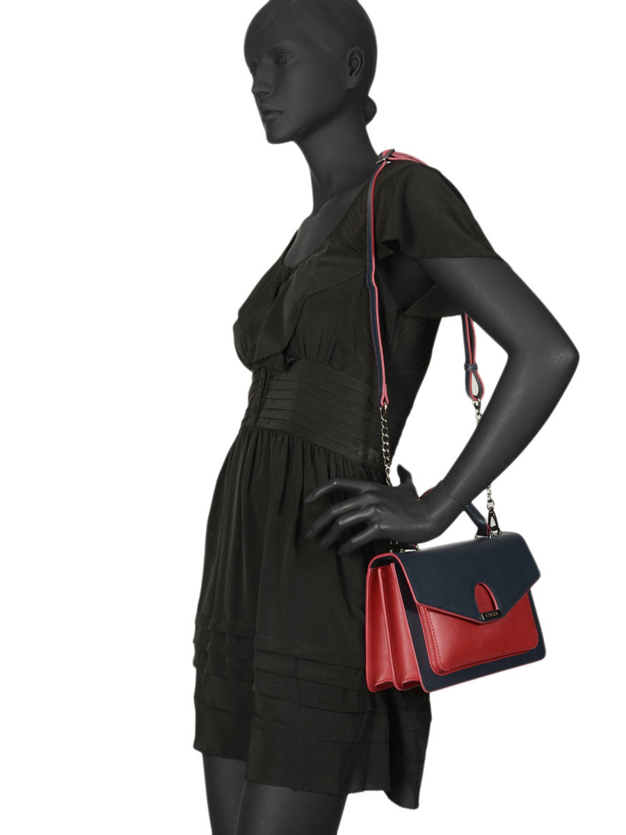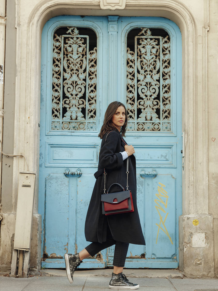 Deze stijlvolle handtas met unieke kleuraccenten komt uit de Escarpe collectie van Etrier. De overslagflap van dit charmante model werd afgewerkt met een unieke cut-out, die doet denken aan de vorm van een stijgbeugel (het logo van Etrier). De tas sluit met behulp van een drukknopje, en beschikt binnenin over twee compacte steekvakjes. Perfect om jouw spulletjes overzichtelijk in op te bergen! Aan de voorzijde is een extra steekvakje voorzien. Tenslotte voorziet Etrier ook een afneembare schouderriem, om dit model gekruist of lang over de schouder te dragen.