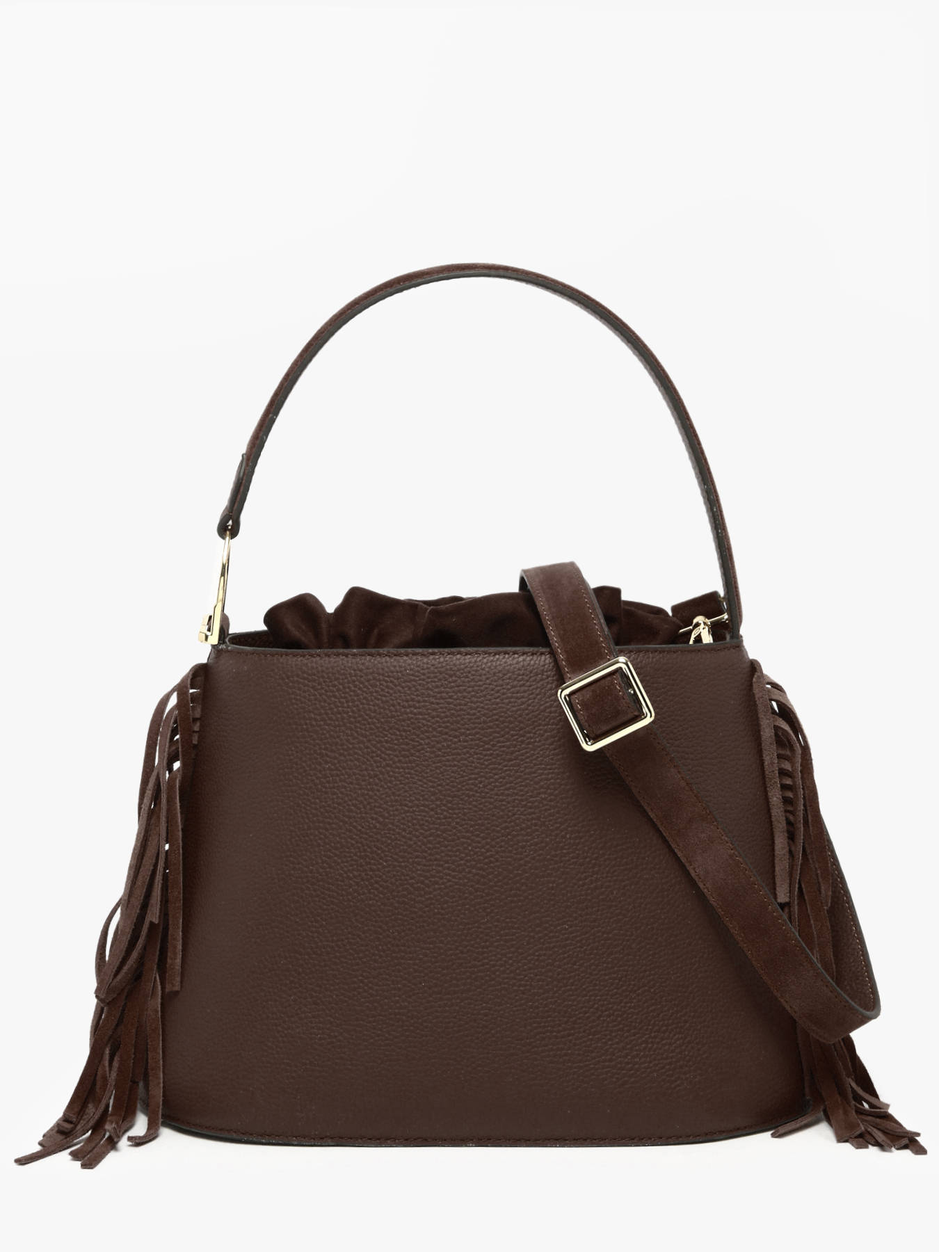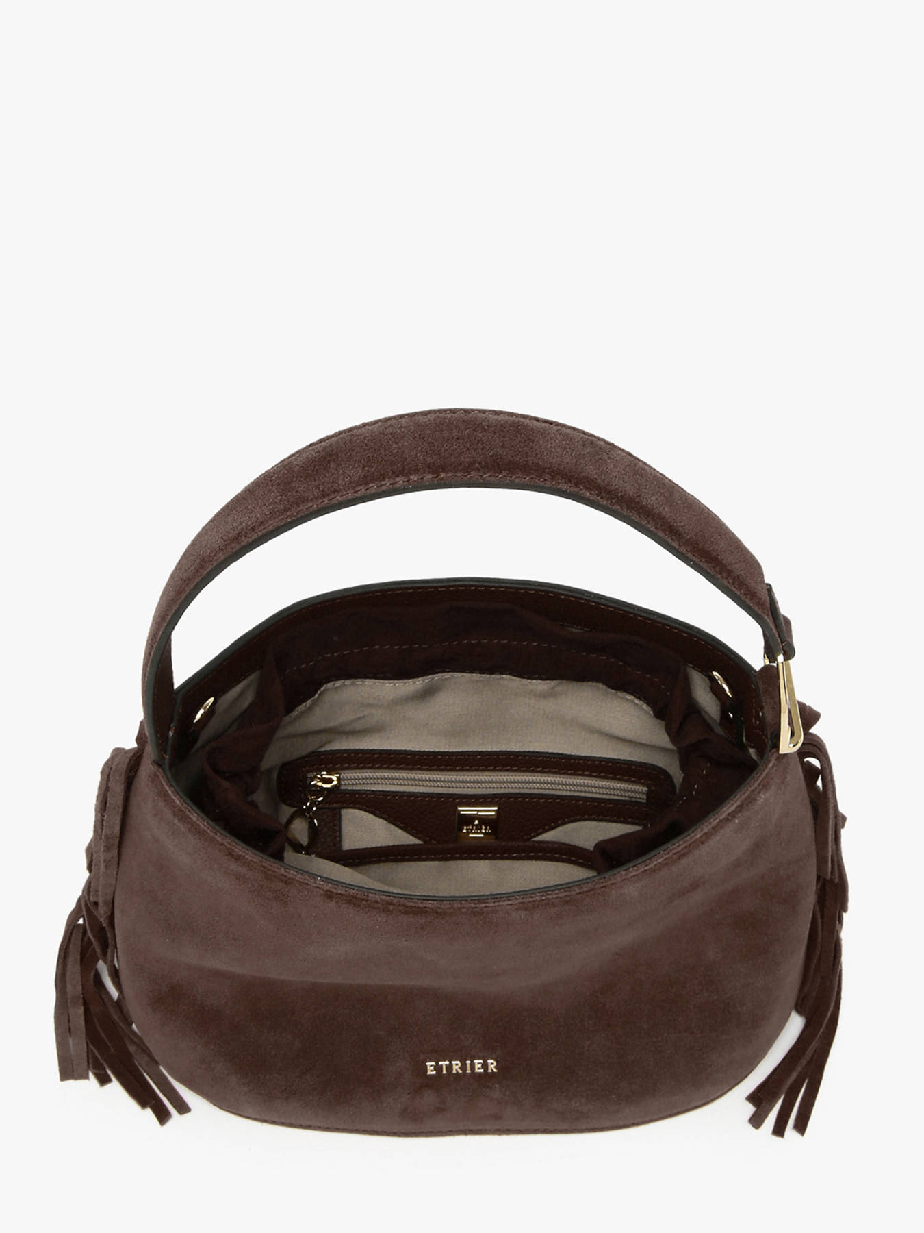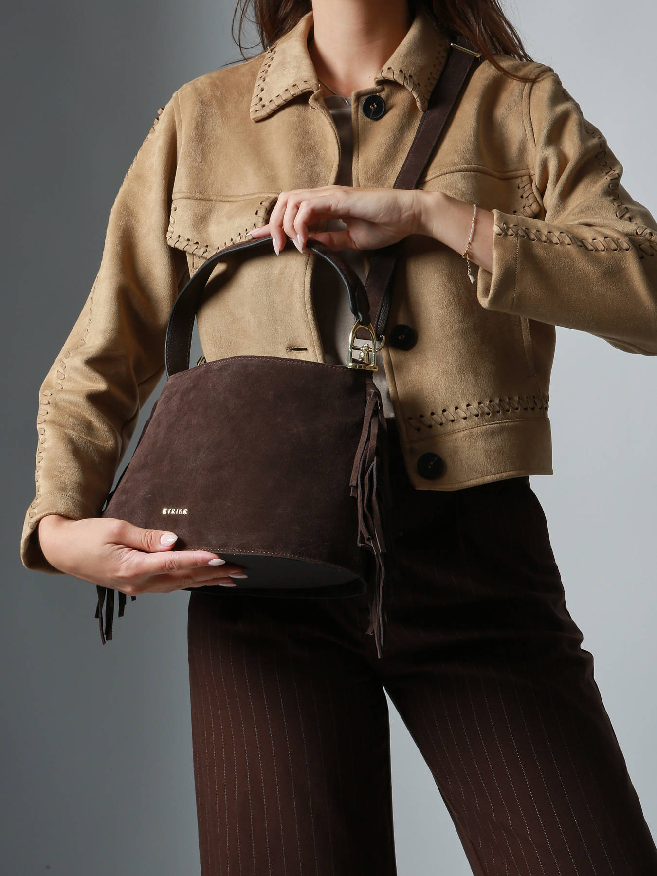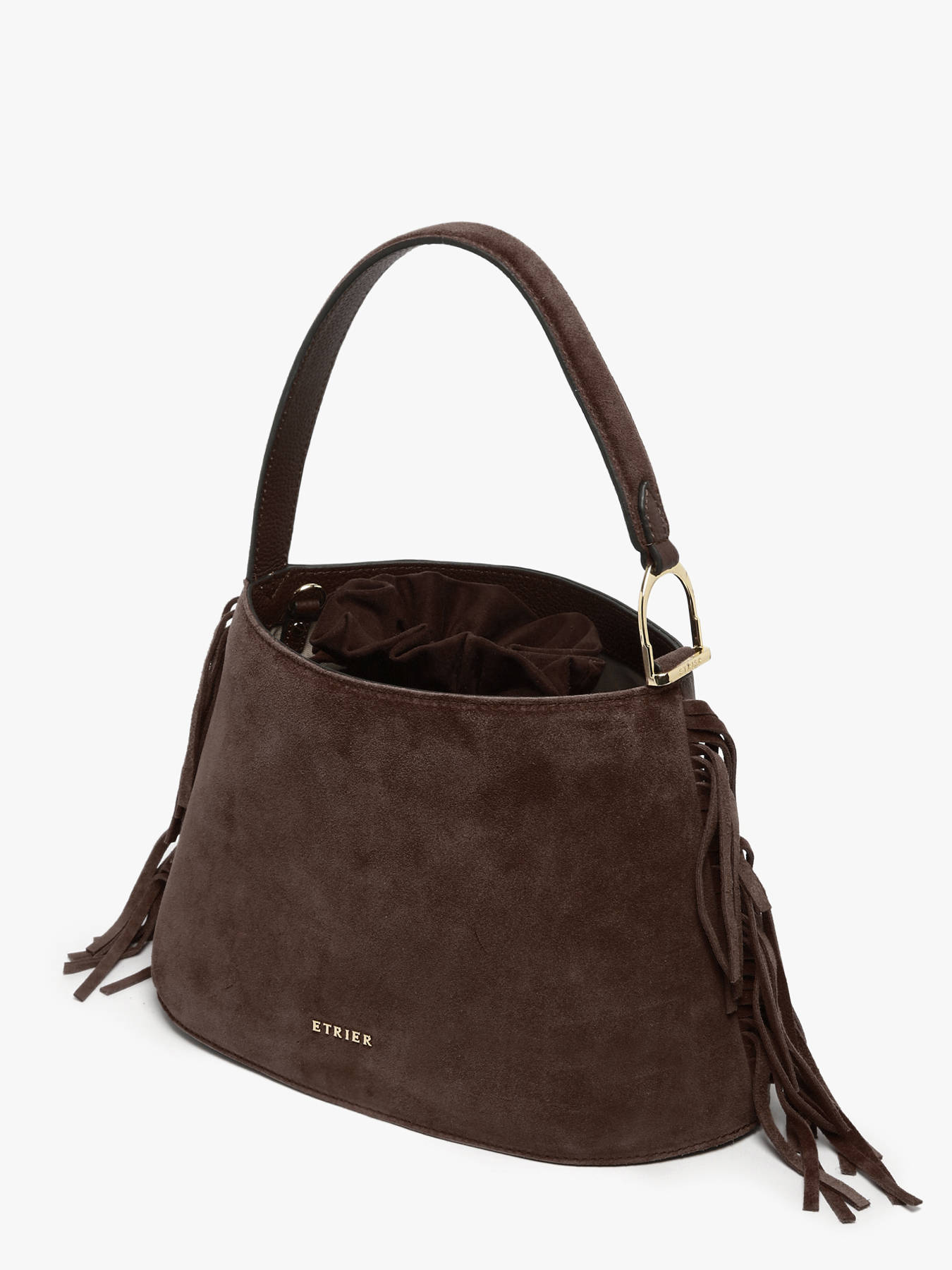 De ETRIER cross body tas uit de COUNTRY-lijn is een bucket bag van suède leer. Hij sluit met een koordzakje. Hij heeft een handvat voor handtas dragen en een schouderriem voor crossbody dragen. De franjes aan de zijkanten geven dit model een gevoel van beweging en vrijheid. Country vangt de essentie van een vrije en elegante stijl, met authentieke texturen en een natuurlijke dynamiek, perfect voor een winterse look. Een Etrier-bijou siert de zijkant van het handvat en geeft deze tas een verfijnde signatuur.