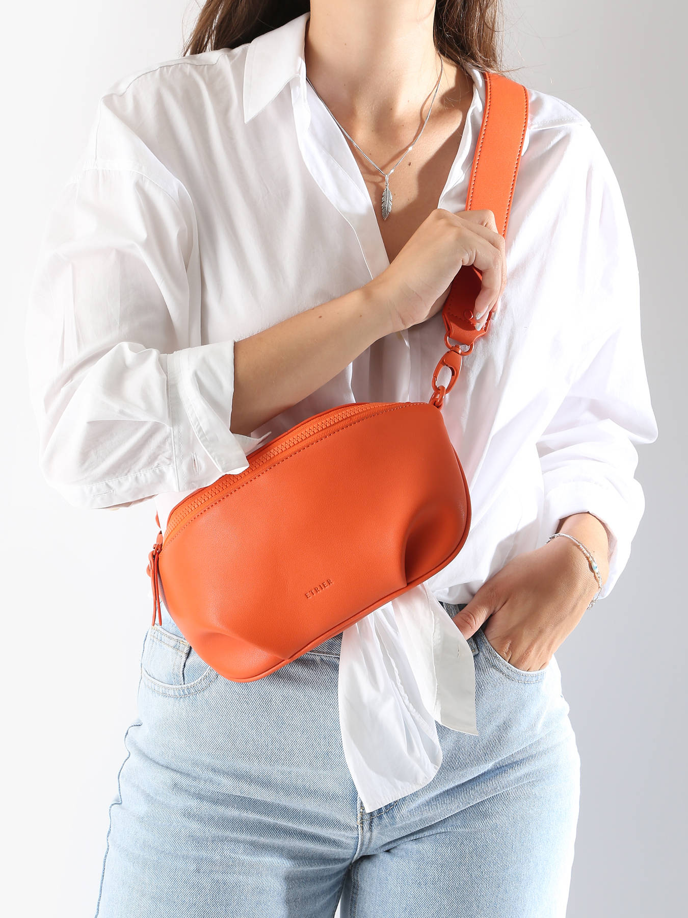 Le sac banane ETRIER de la ligne OXER incarne une esthétique minimaliste, originale et audacieuse. Fabriqué en cuir de vachette, il est doté d'une fermeture zippée et d'une large bandoulière réglable et amovible. Avec son grand compartiment, il est idéal pour transporter vos essentiels quotidiens.