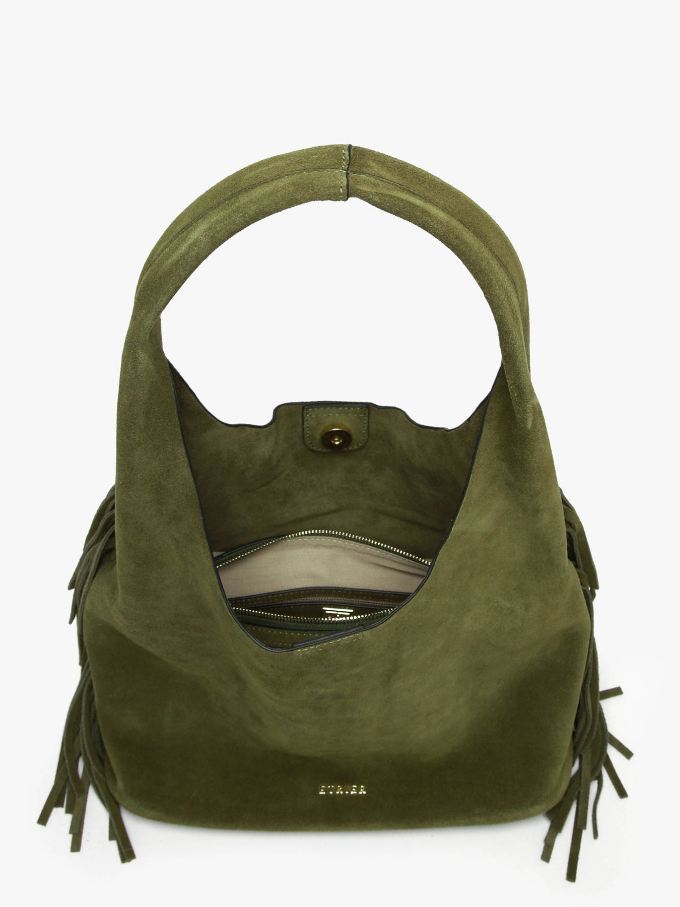 Le sac porté épaule ETRIER de la ligne COUNTRY est en cuir velours. Ce petit format M à la silhouette hobo se distingue par ses franges latérales et son style bohème affirmé. Il possède une poche plaquée en cuir lisse au dos. Il se ferme à l’aide d’un aimant. L’intérieur est doté d’un pochon amovible pour organiser vos essentiels. Ce modèle compact incarne un esprit libre et élégant, parfait pour réchauffer vos tenues hivernales avec caractère et authenticité.