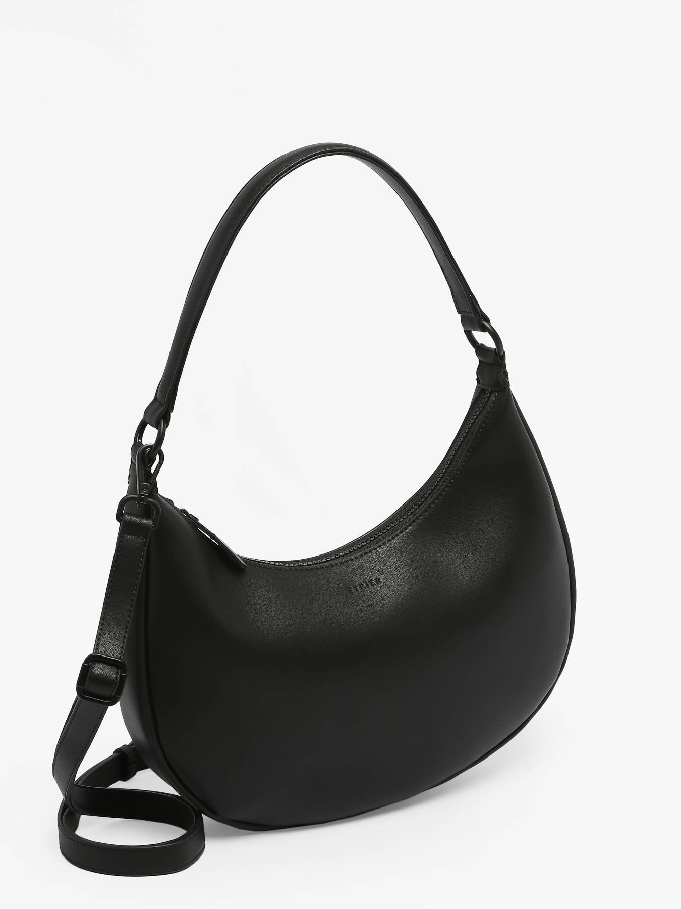 De schoudertas ETRIER uit de OXER lijn, in halve maan formaat, kiest voor omgekeerd leer, waardoor zijn ontwerp rondheid en zachtheid krijgt. Gemaakt van runderleer, heeft het een zak aan de achterkant en sluit het met een rits. De leren handgreep en de verstelbare en afneembare schouderriem bieden veelzijdige draagmogelijkheden: schuin over de schouder of op de schouder. Het ruime interieur bevat een compartiment met twee geplaatste zakken en een ritszak voor een optimale organisatie.