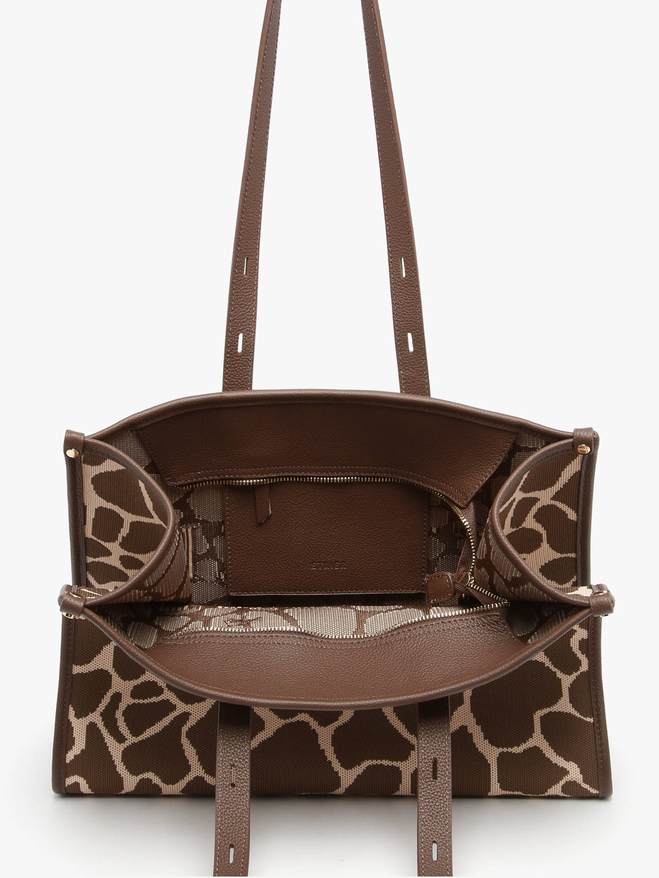 The SAFARI tote bag by ETRIER reinvents the iconic tote in a bold and fashion-forward design. Crafted from textile with leather trim, it stands out with its graphic animal prints that create a strong, contemporary look. Spacious and functional, its size L format is perfect for accompanying you throughout your summer days, whether in the city or on a getaway. The 28 cm handles provide comfortable shoulder wear, while the zip closure keeps your belongings secure. Inside, a zippered pocket allows you to keep your essentials within easy reach. A practical and stylish tote, designed for those who love to combine confident elegance with a wild spirit.